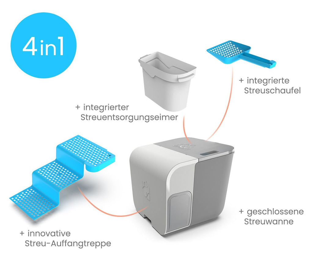 Dank der innovativen, integrierten Streu-Auffangtreppe bleibt das Streu dort, wo es hingehört – in der Toilette. Eine weltweite Neuheit, die für eine streufreie Wohnung sorgt.